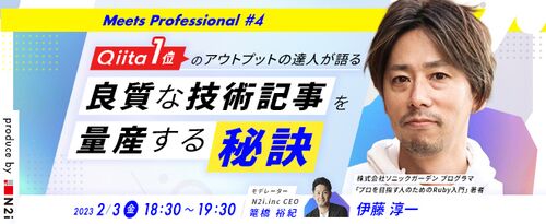 登壇のお知らせです。株式会社N2i(エヌツーアイ)さん主催の公開社内イベント・Meets Professionalで「Qiita 1位のアウトプットの達人が語る、良質な技術記事を量産する秘訣」というタイトルの講演をさせてもらいます。n2i-engineer.connpass.com講演内容の…