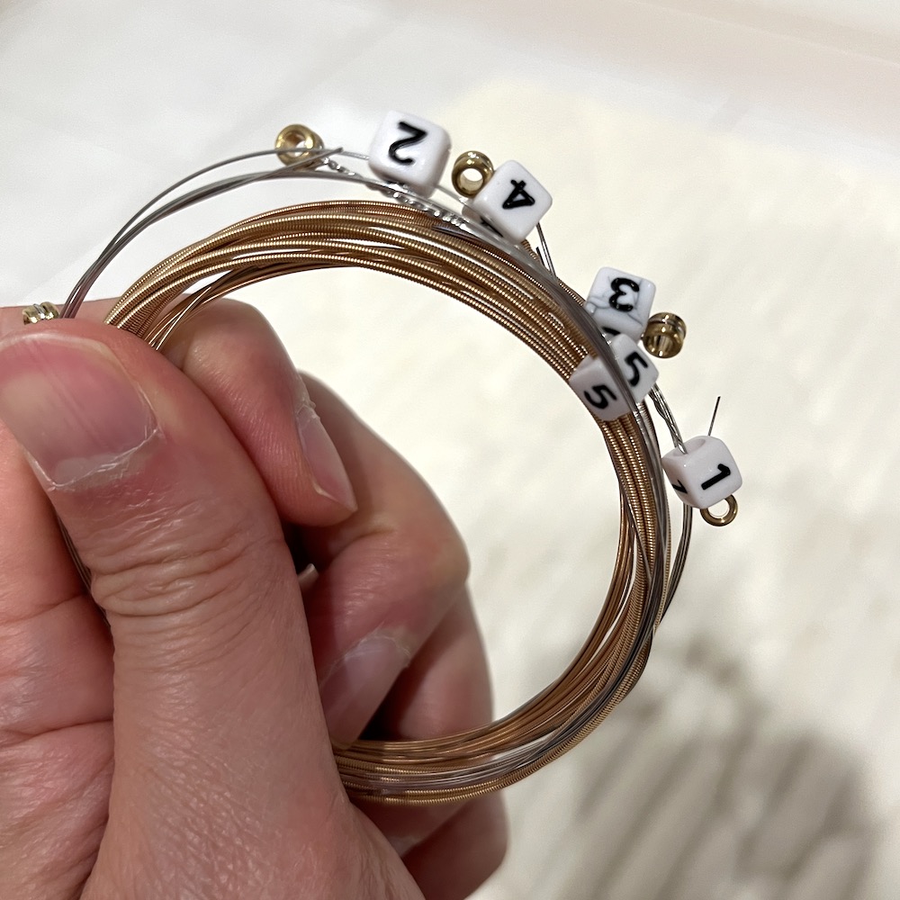 袋をあけたら、弦の番号が書かれたサイコロみたいなものが弦に通してありました。