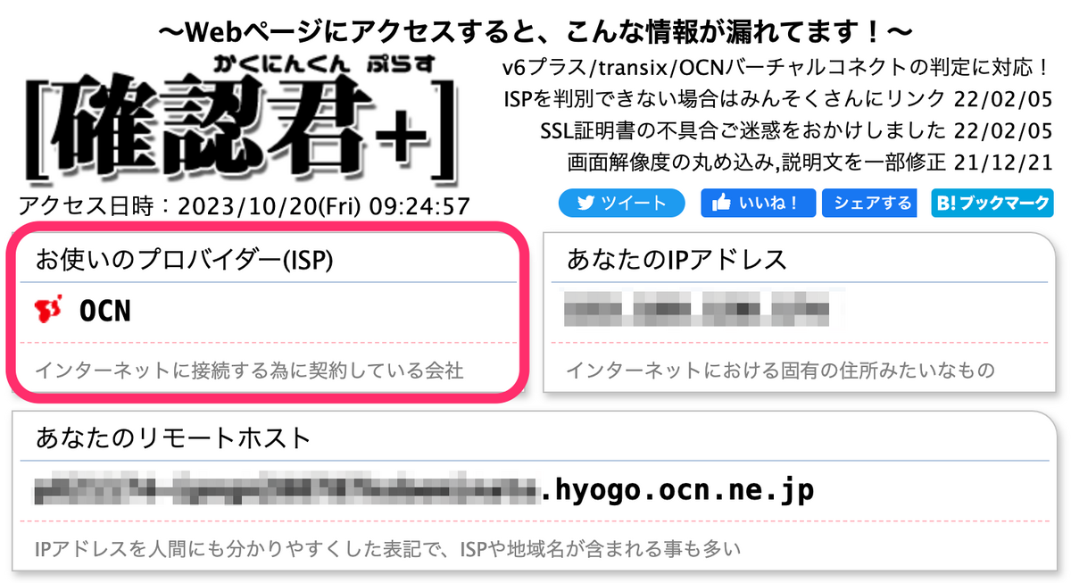 こういう場合は「確認君プラス」を使うと、下記画像の赤枠部分に現在利用しているプロバイダと通信規格が表示されます(以下はOCNのIPv4の表示例ですが、IPv6だと「OCNバーチャルコネクト」と表示されます)。